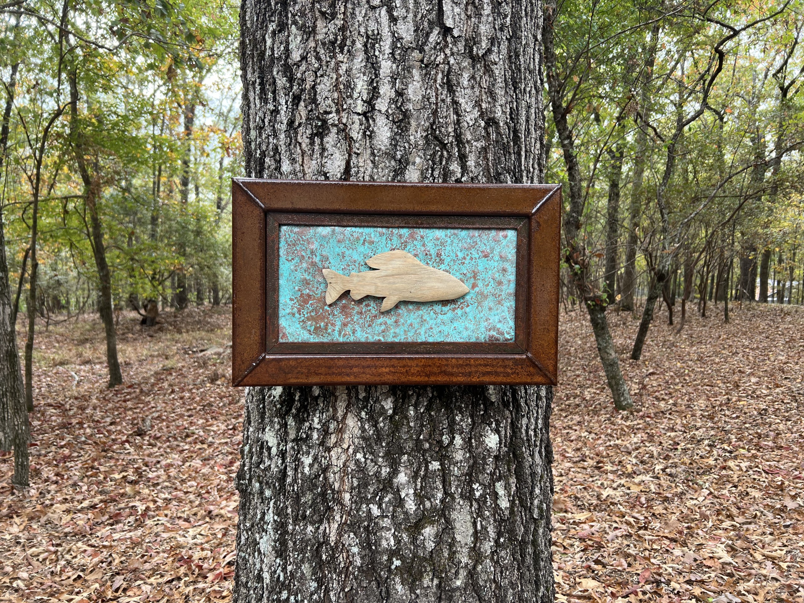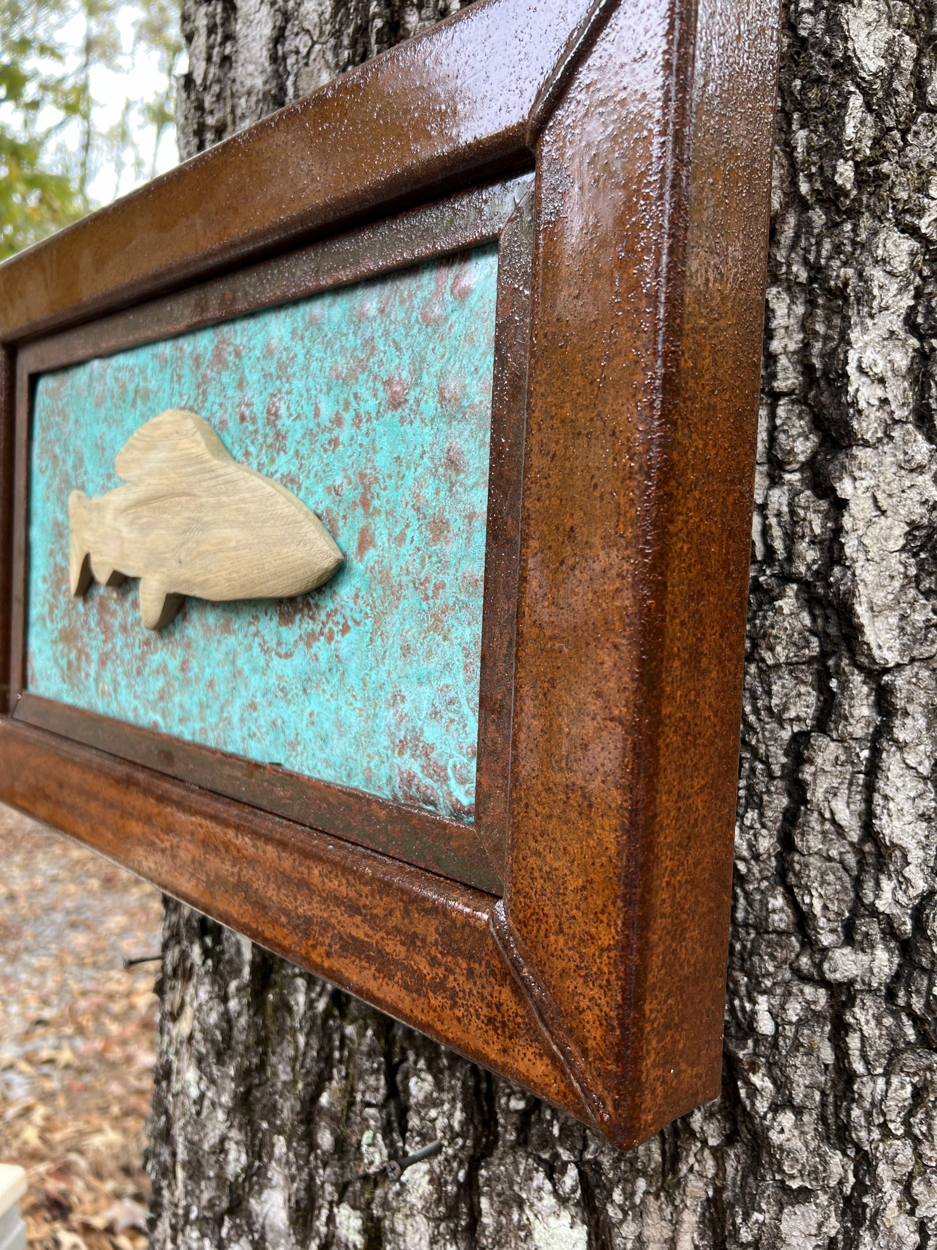 This one has a similar story to my Copper Paddle. The Grayling is hand carved from a piece of cypress wood that I found at a small local mill. I stained it with a natural salt stain. The background is copper that I hammered to create a topography look. We then gave it a green patina with vinegar and salt. I finished the piece with one of my beautiful, rusted steel frames. The frame is coated with polyurethane a few times to protect that awesome rust patina. We provide the French cleats to hang easily and securely.