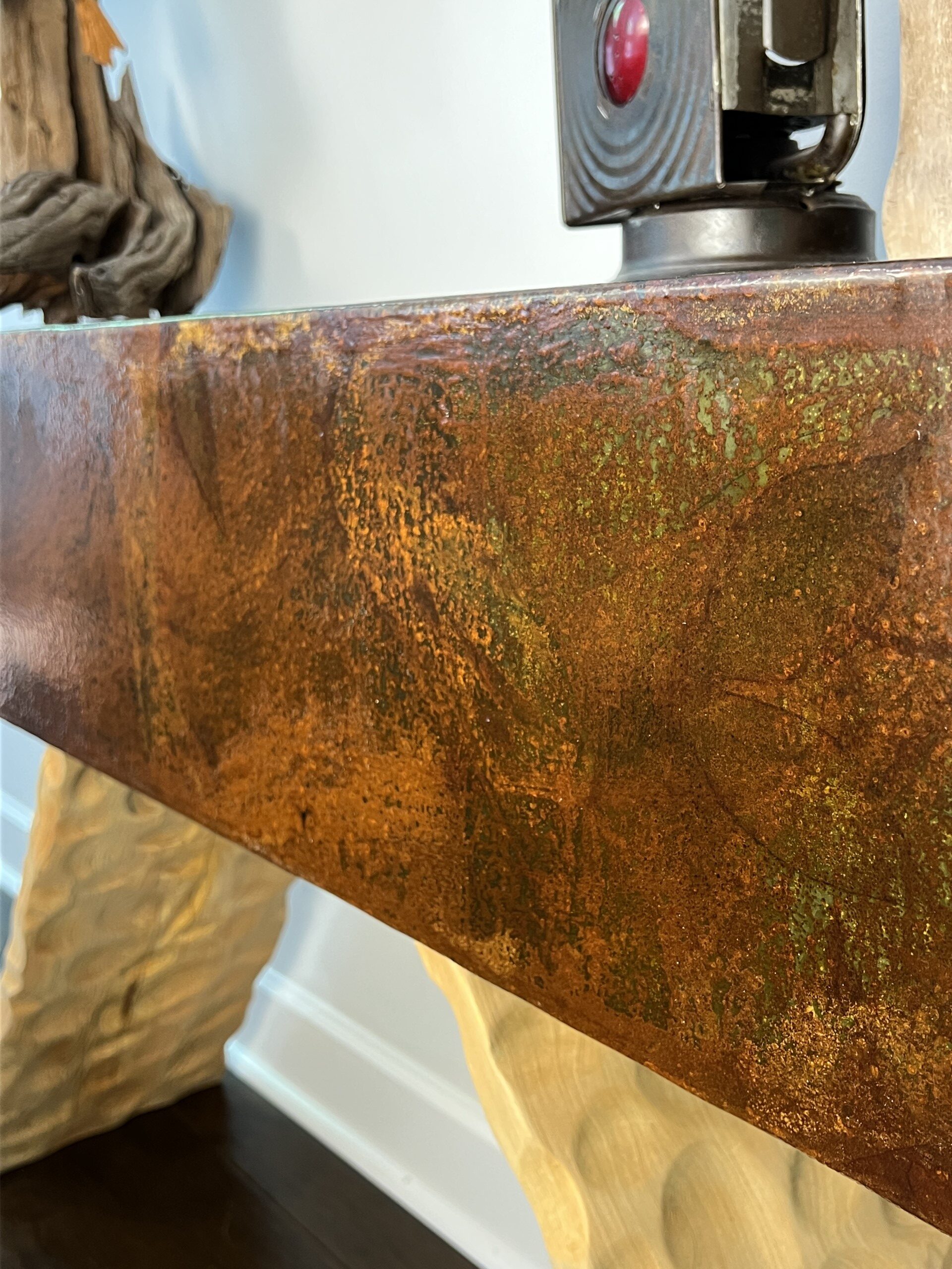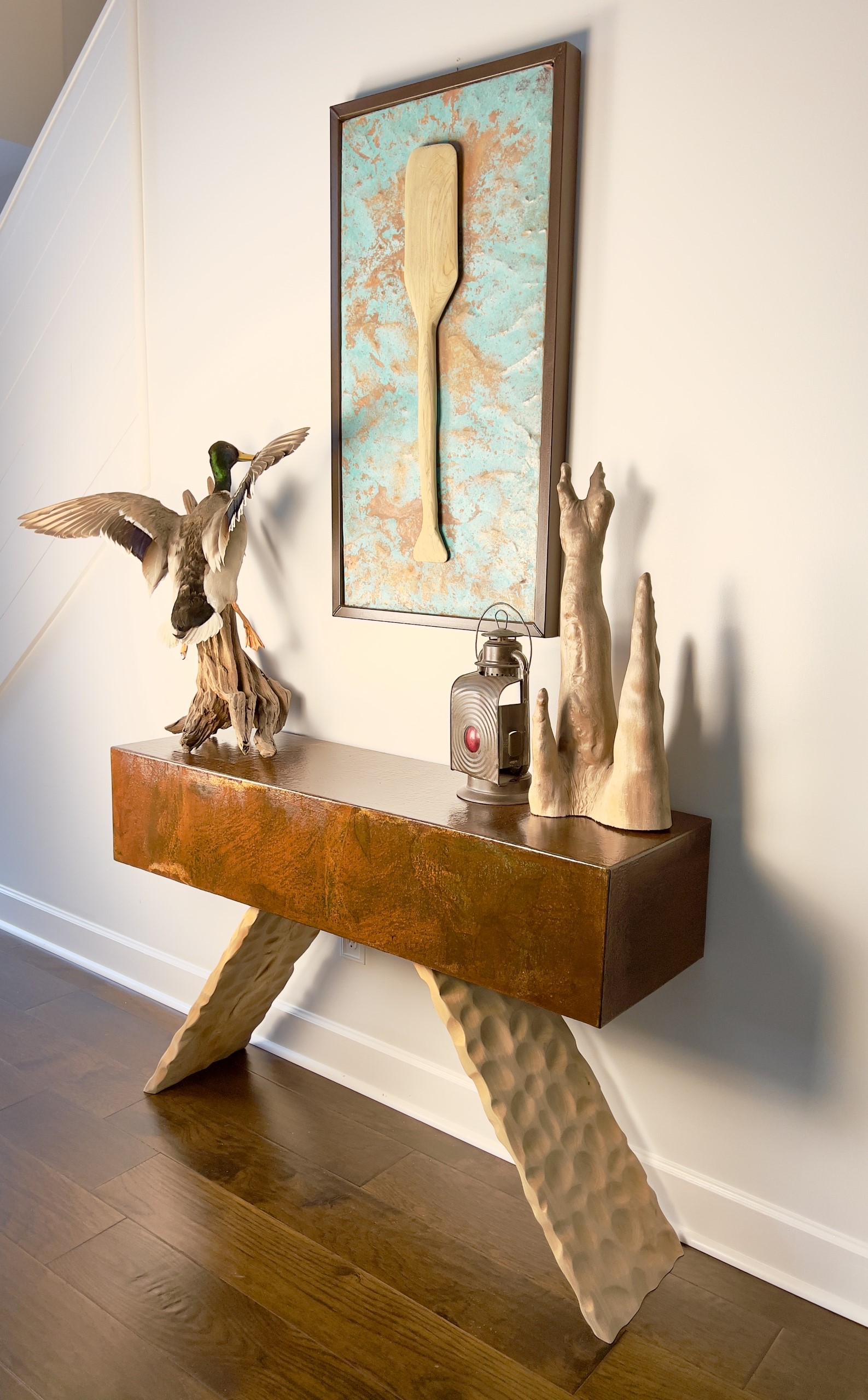 This one took a lot to produce. I welded all sides then grounded and smoothed them down to perfection to create a seamless rectangular steel box. Then I made smaller boxes underneath, but only inside, to hold the wooden legs. The box was then put in the patina phase. For the legs, I chose Cypress wood; I carved scalloped divots and smoothed them out so that you could see the layers of wood grain. The tabletop was given a few coats of polyurethane. The legs received an Alabama clay stain and then waxed for protection.