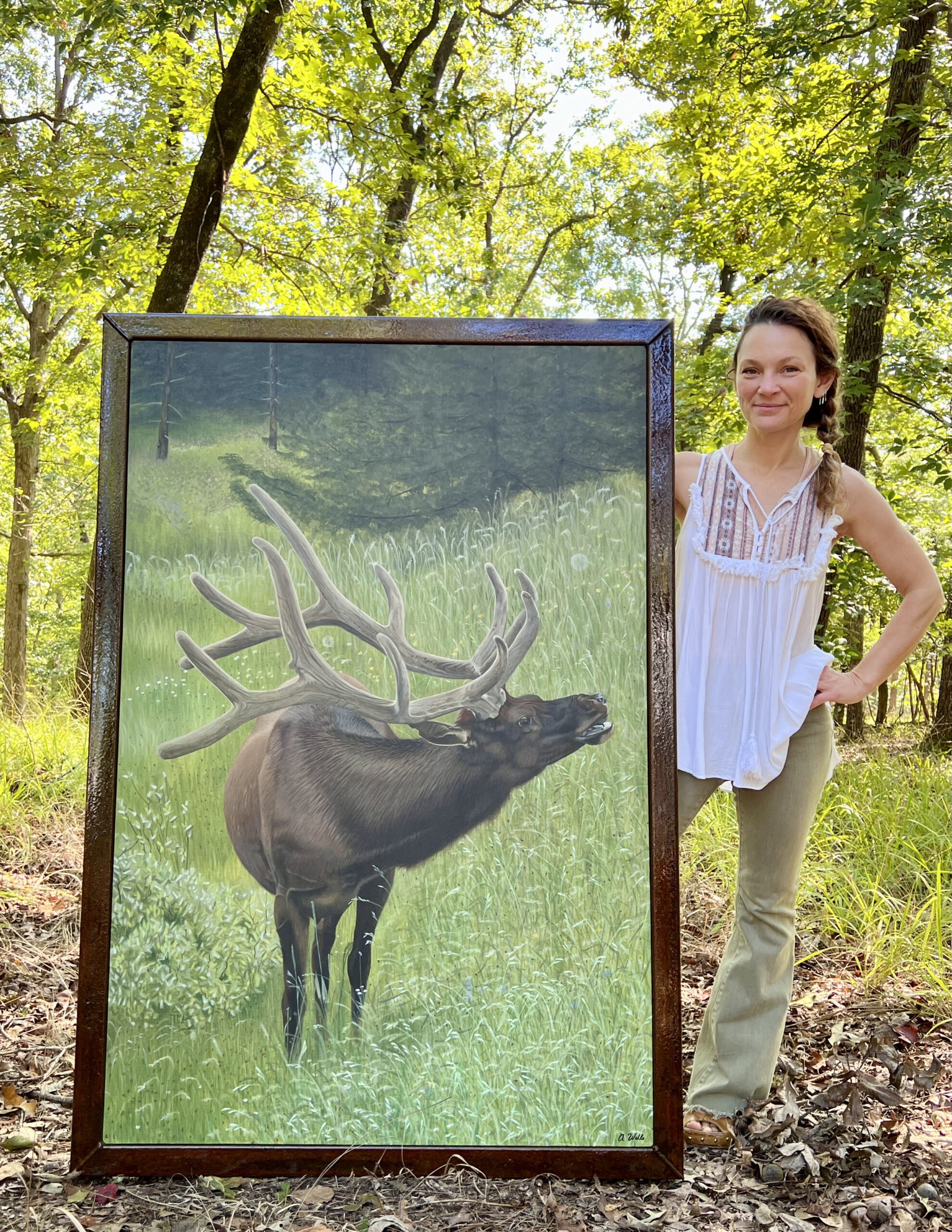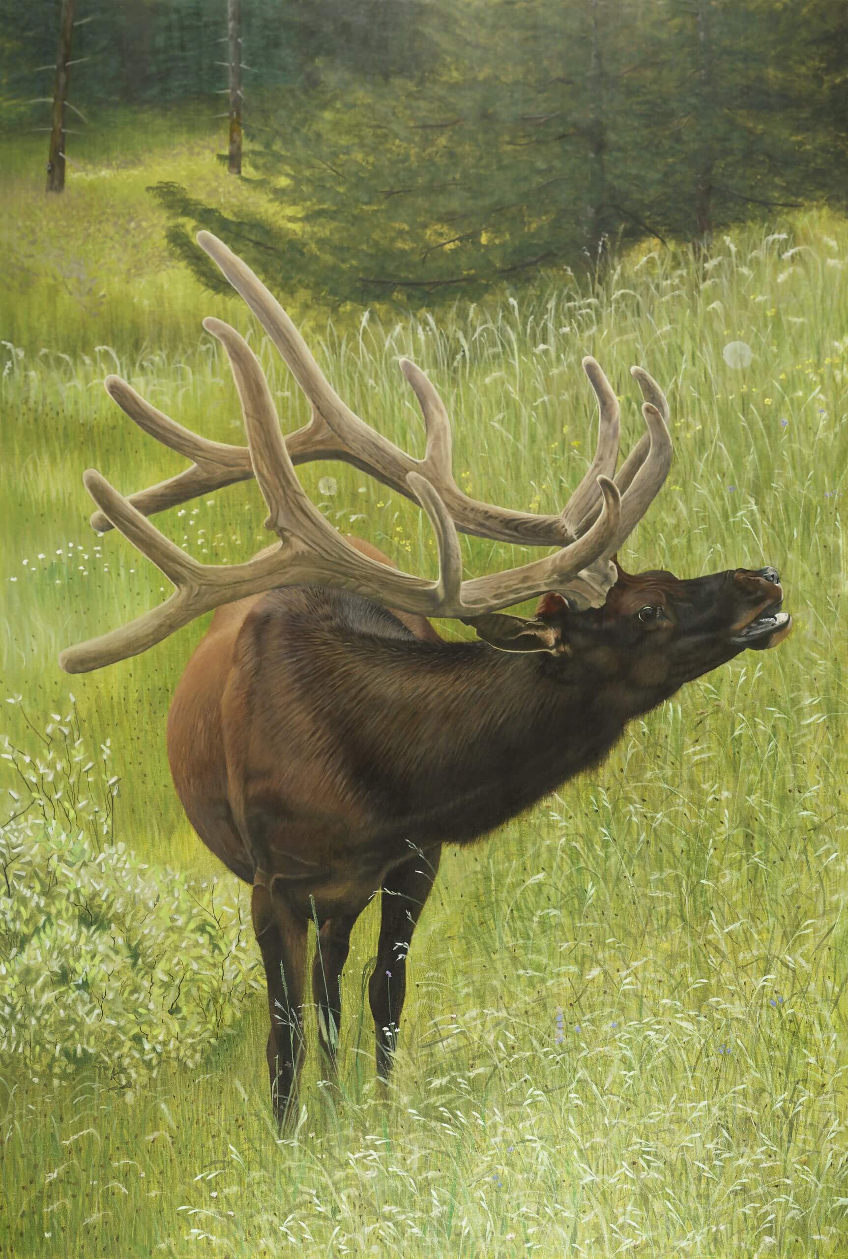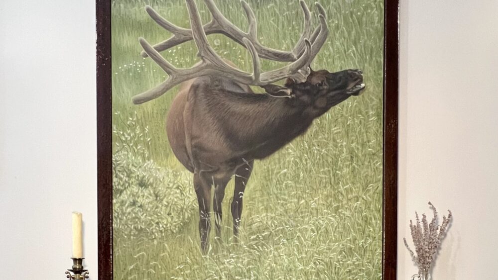 This painting was created from a photograph that my husband took on a trip we made to Jackson Hole in the summer of 2015. The elk is bugling for a mate. So we thought Summertime Blues was a fitting name for this piece.
